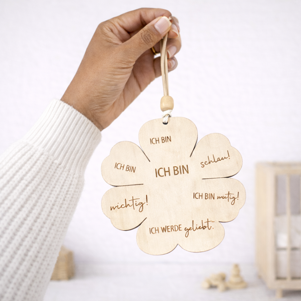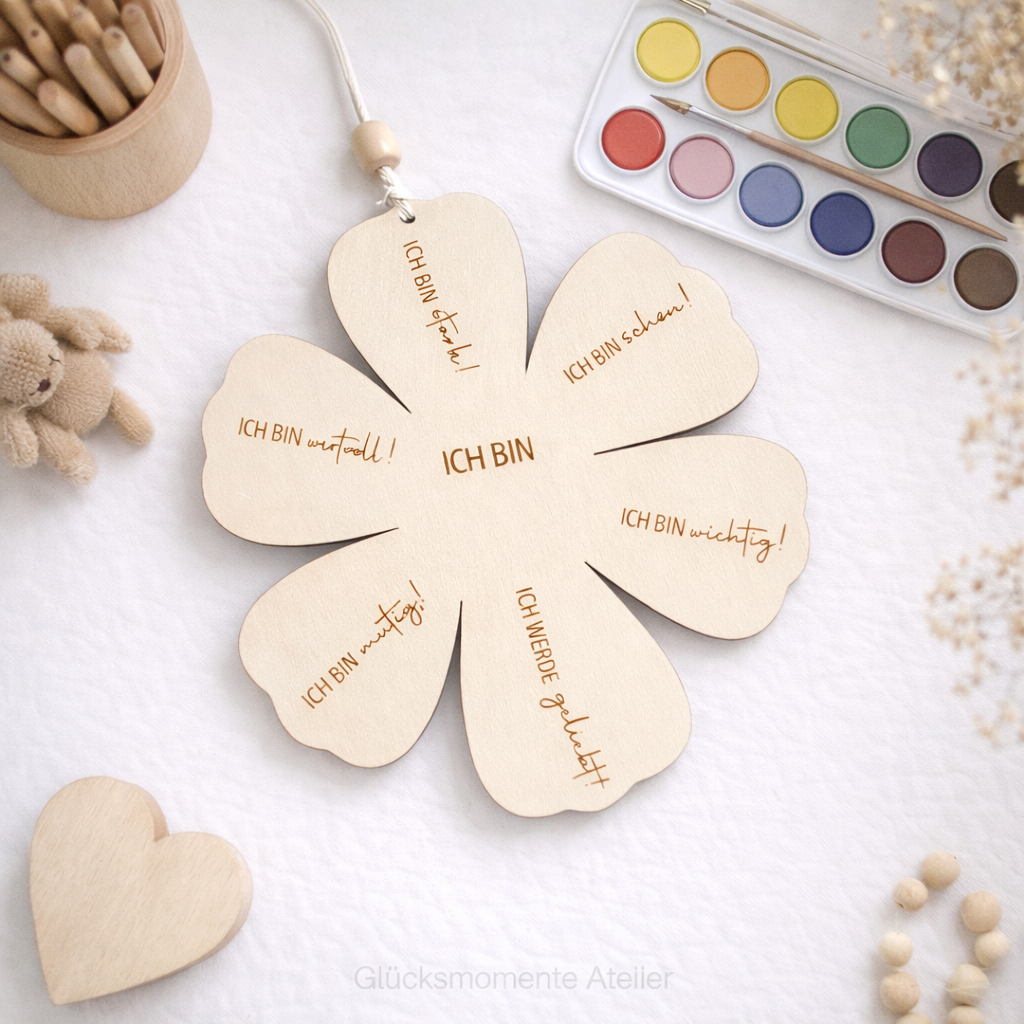 Die Affirmationsblume hat 6 tolle Affirmationen graviert. Sie bringt den Kindern im “vorbeigehen” tolle Botschaften, die sie quasi einbrennen in ihrer Seele.