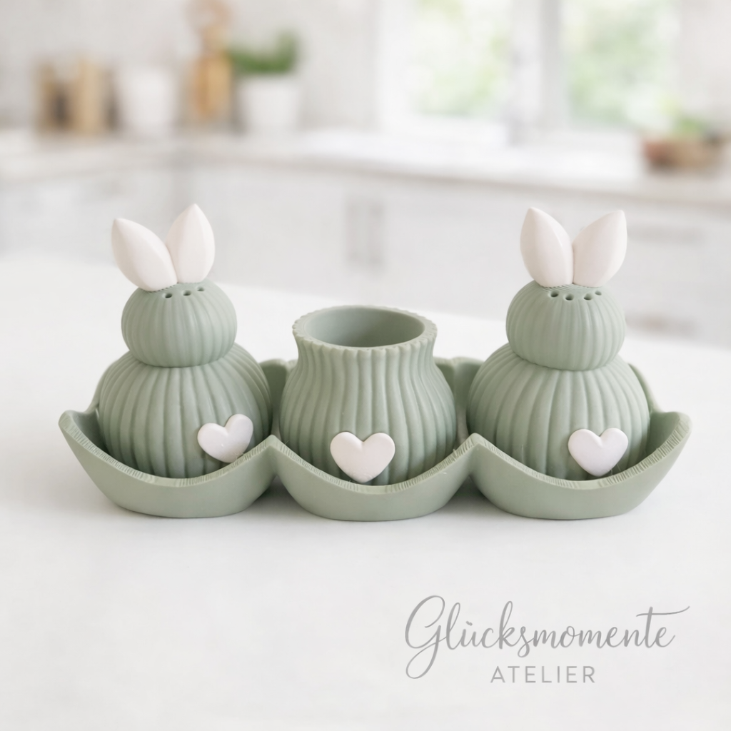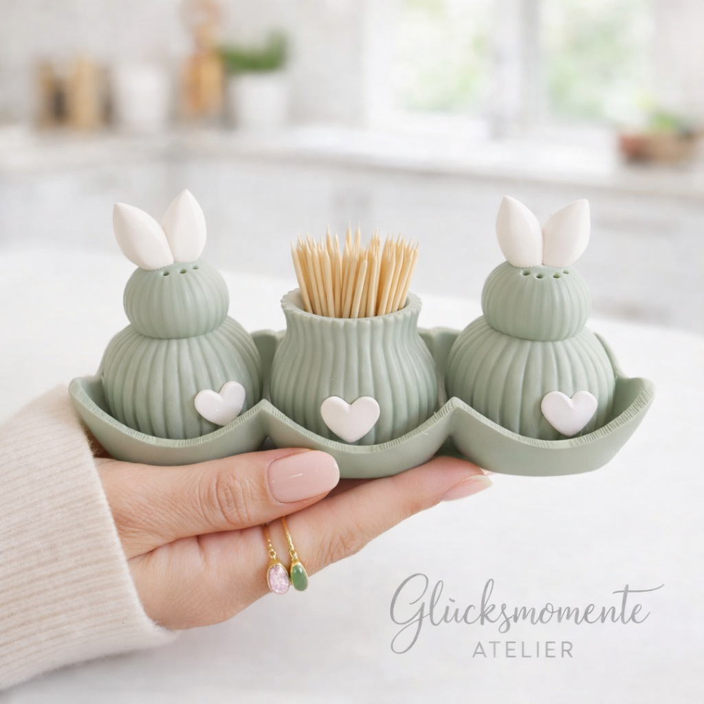 Das Set besteht aus zwei Kaninchen, einem Zahnstocherbecher und einer dekorativen Eierschalenschale mit Herzdetails – ideal als Frühlings- oder Osterdekoration oder als besonderes Geschenk.
