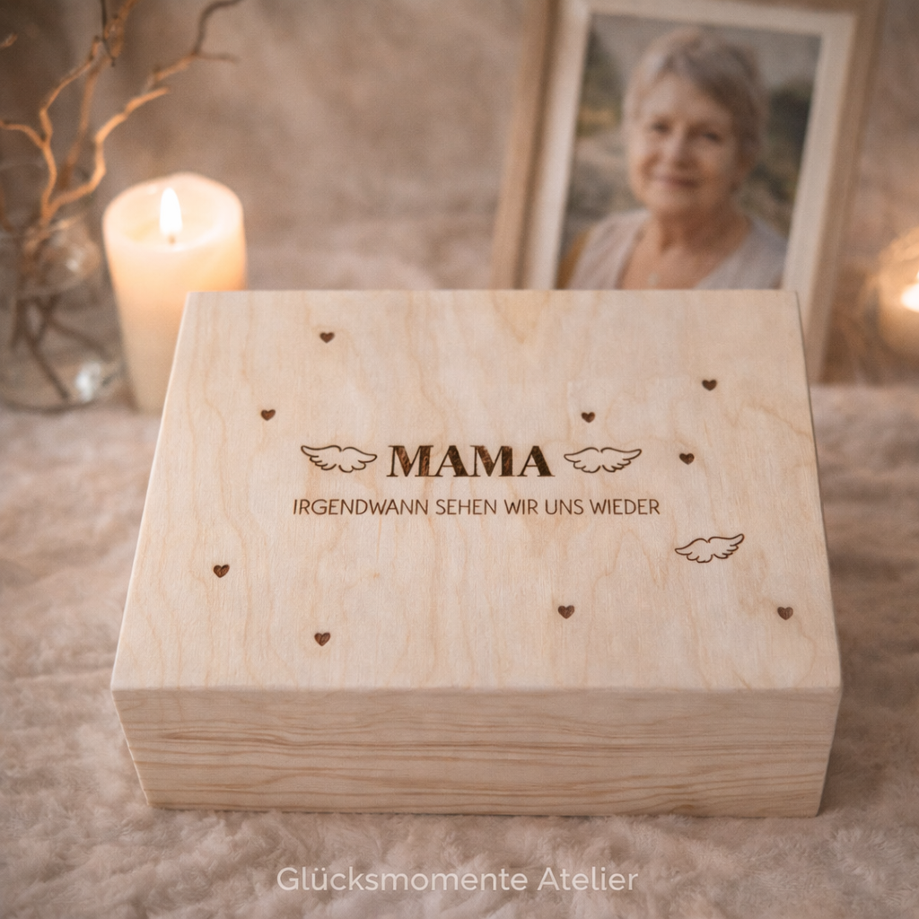 Um die wichtigsten Erinnerungen nicht nur im Herzen zu behalten, kannst Du jetzt auch die wertvollen Andenken in würdiger Art und Weise in einer wunderschönen Holzbox aufbewahren.