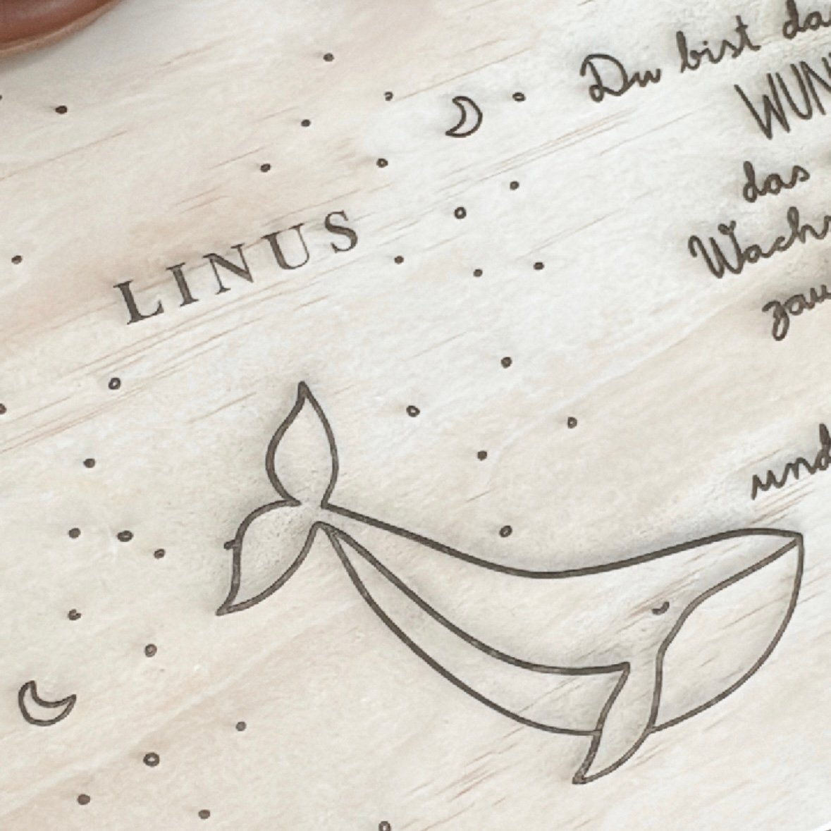 Bitte beachte, dass Holz ein Naturmaterial ist und unterschiedliche Strukturen, Maserungen und asteinschlüsse aufweist. Daher ist es möglich, dass an manchen Stellen die Gravur nicht ganz gleichmässig ist.