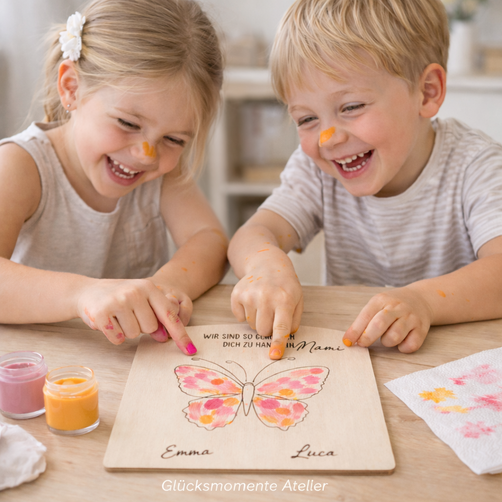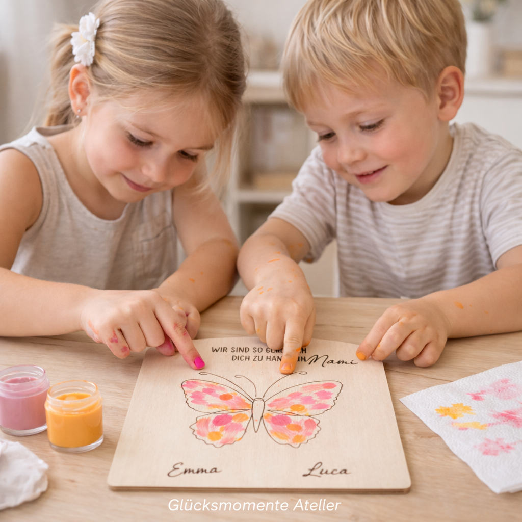 Ihre Kinder können sich dann mit Fingerfarbe oder Acrylfarbe mit Handabdrücken verewigen.