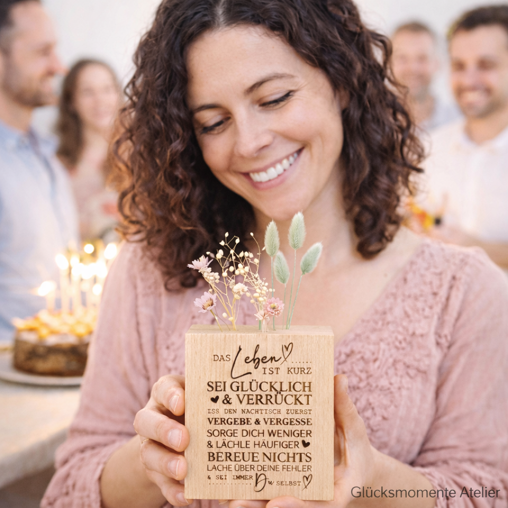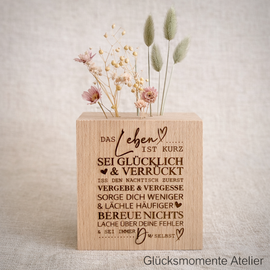 Wenn Du magst, kann ich dir den Flower Cube auch individuell gravieren: Mit den Namen des Brautpaares, der Freundin, der Mama, des Papas, der Oma oder des Opas oder der Lieblingsperson, oder einfach nur mit einem deiner Lieblingssprüche.
