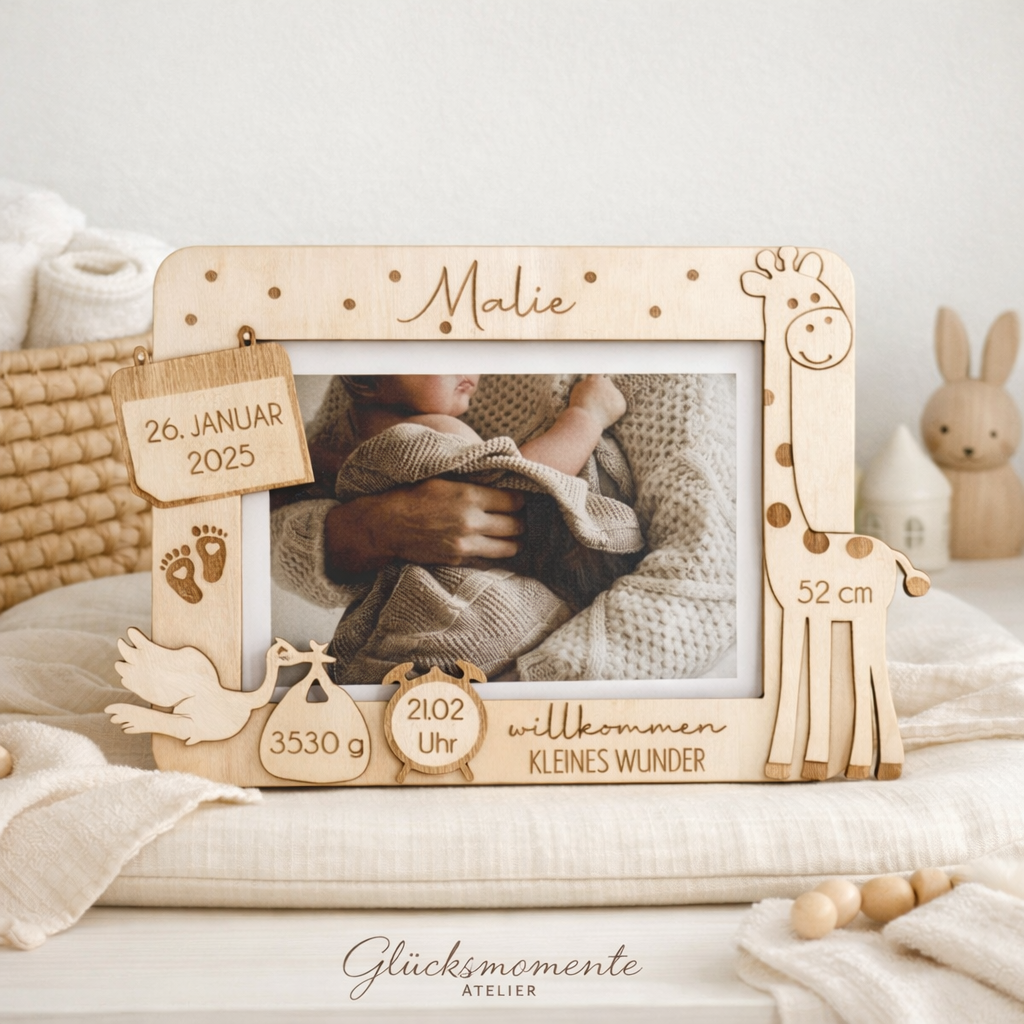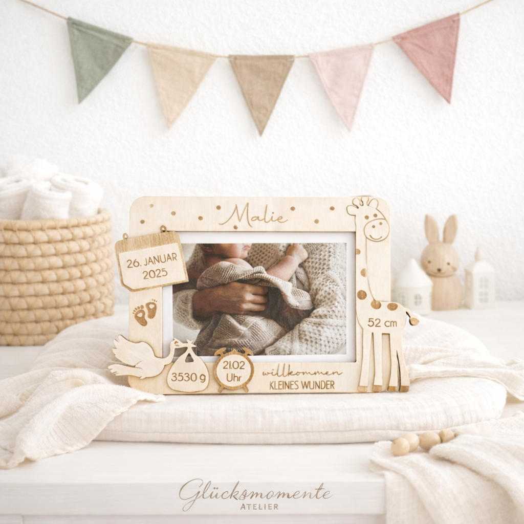 Der Rahmen für ein Foto mit allen wichtigen Daten der Geburt des Kindes.
