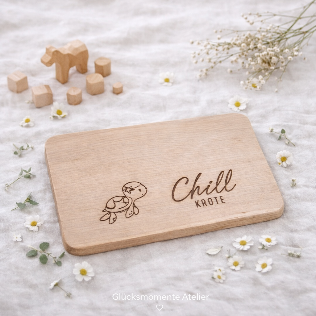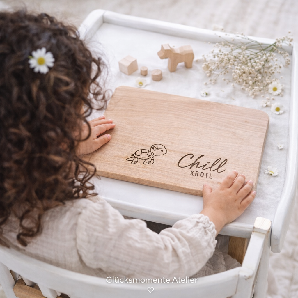 Personalisiertes Frühstücksbrett mit dem niedlichen Motiv der Chillkröte und eingraviertem Namen, der jeden Morgen ein Lächeln auf das Gesicht zaubern wird.