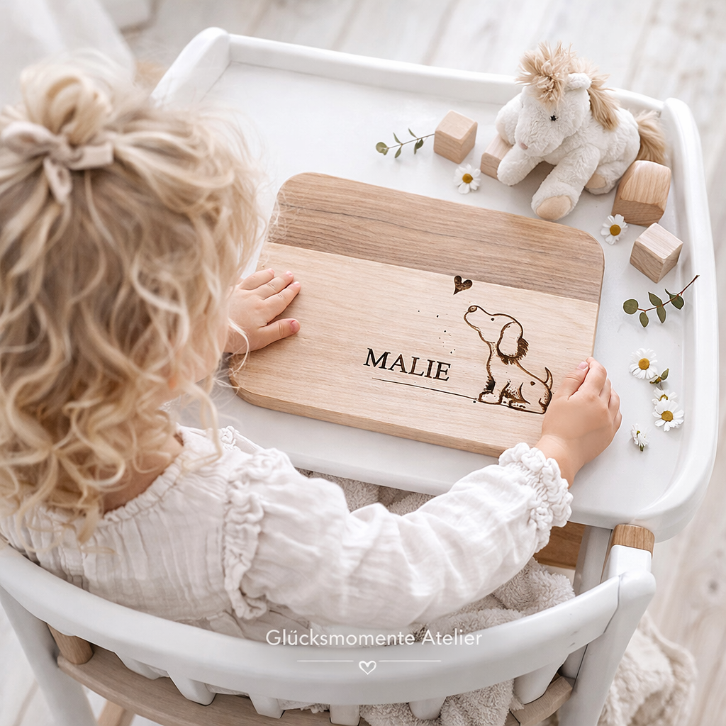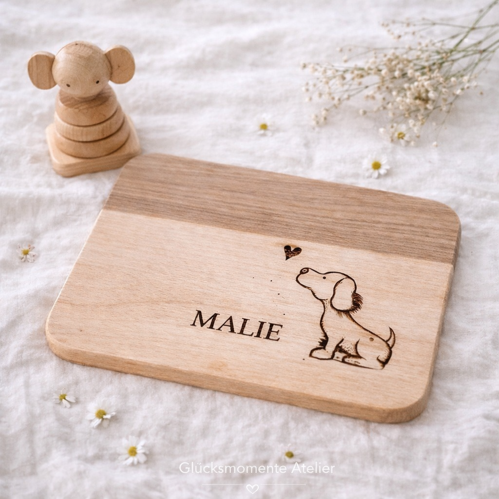 Personalisiertes Frühstücksbrett mit dem niedlichen Motiv des Hundes und eingraviertem Namen, der jeden Morgen ein Lächeln auf das Gesicht zaubern wird.