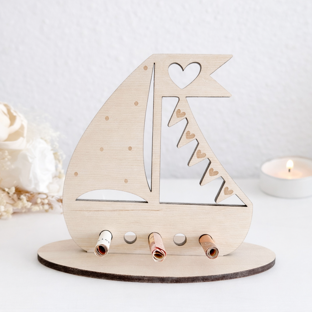 ⛵ Personalisierte Geldgeschenkverpackung für Kommunion, Taufe & Konfirmation – handgefertigtes Holzschiff