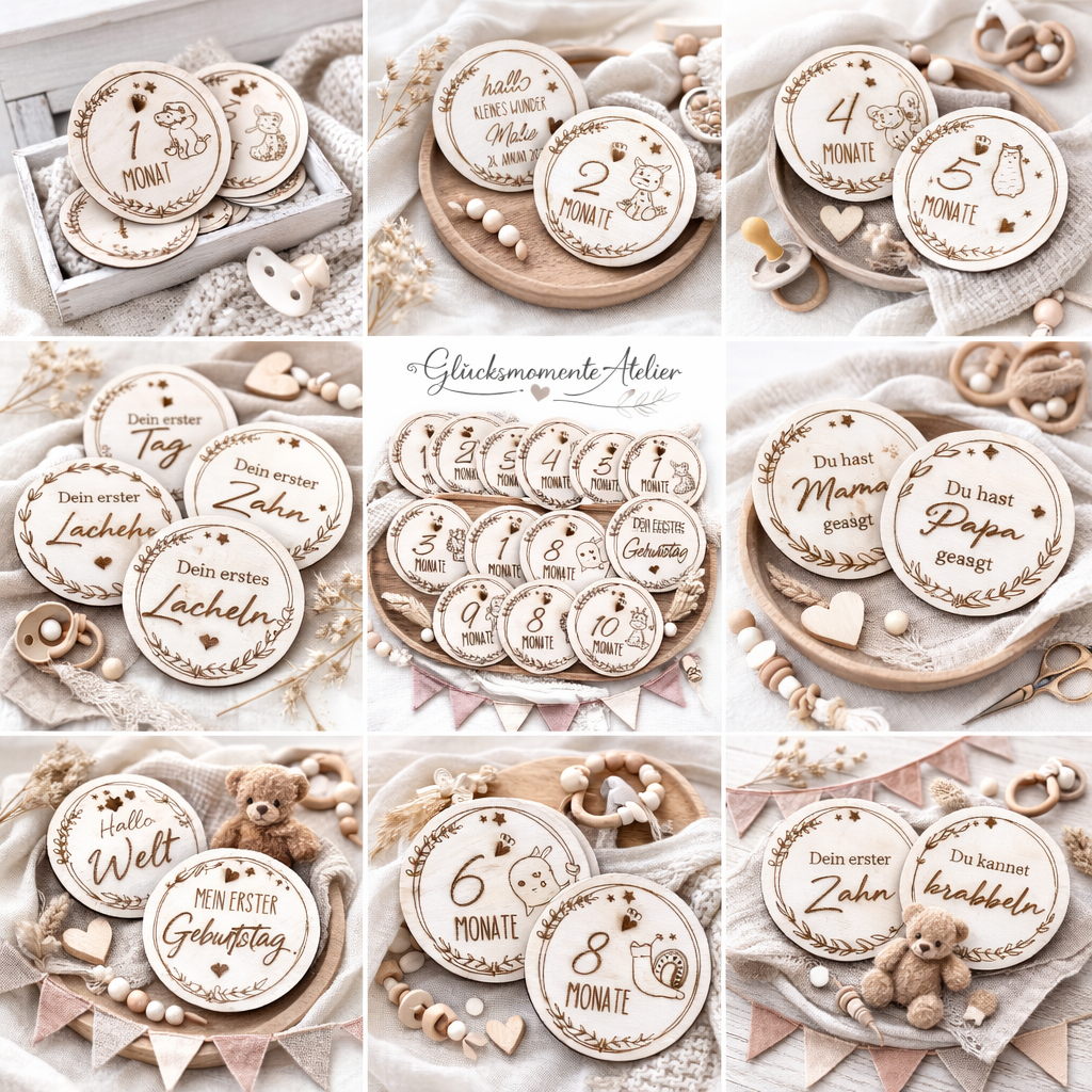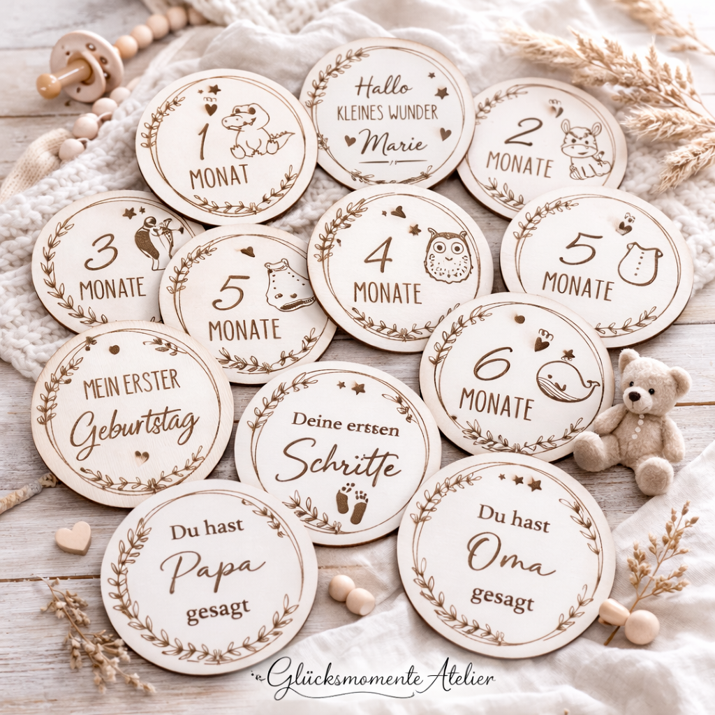Die Karten aus 4mm starkem Birkenholz sind ein wunderbares Fotoaccessoire und ein tolles Geschenk für ein neues Baby.