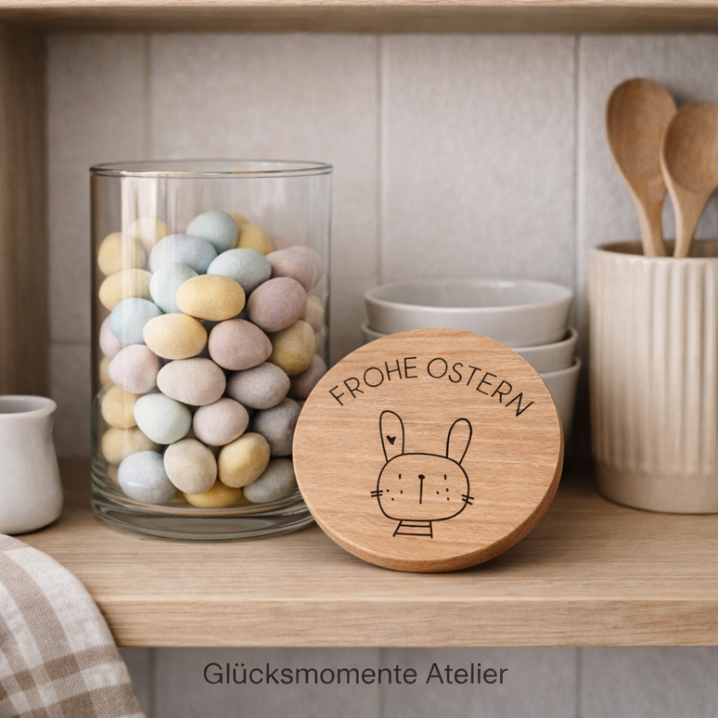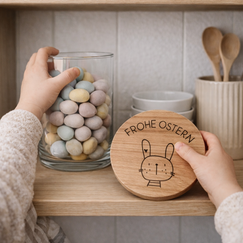 In diesem Vorratsglas mit dem niedlichen Hasen und dem individuell personalisierten Namen auf dem Holzdeckel lassen sich alle möglichen Leckereien, wie Bonbons, Fruchtgummi, Nüsse, Schokolade oder ein paar Kekse super gut aufbewahren.