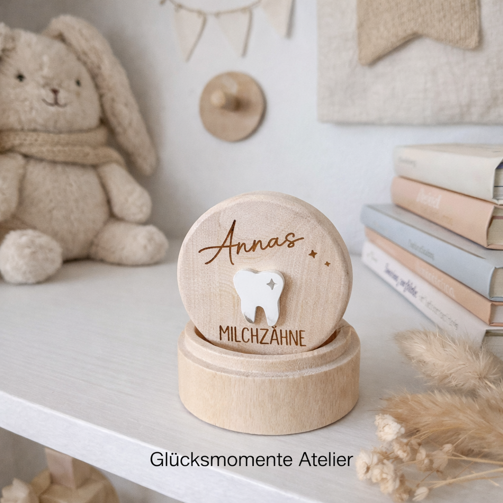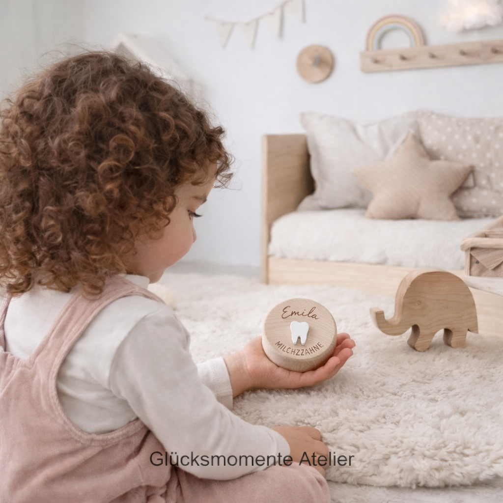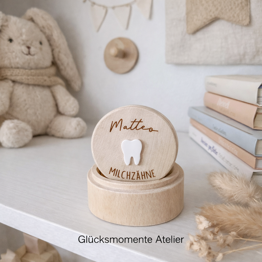 Damit die kleinen Zähnchen schön und sicher gesammelt werden können, habe ich eine hölzerne Milchzahndose gestaltet, die mit dem Kindernamen personalisiert wird.