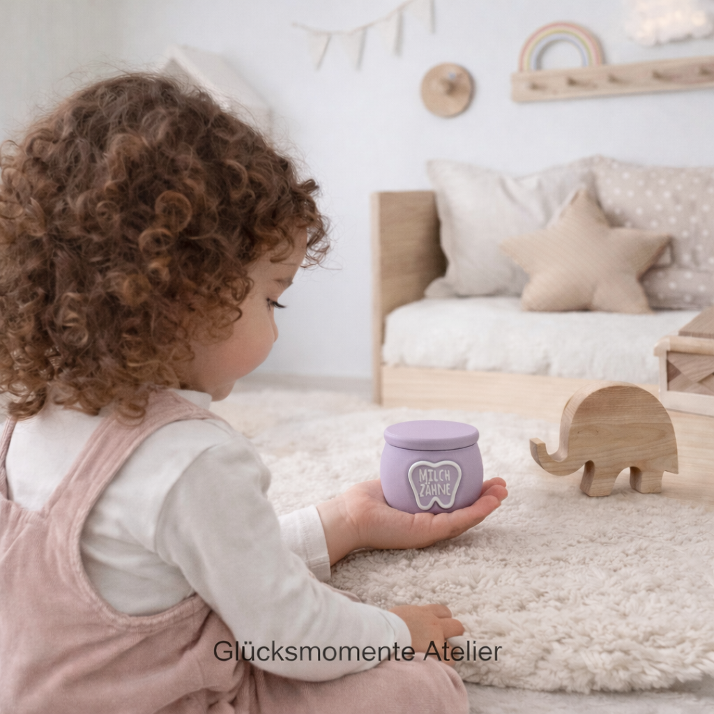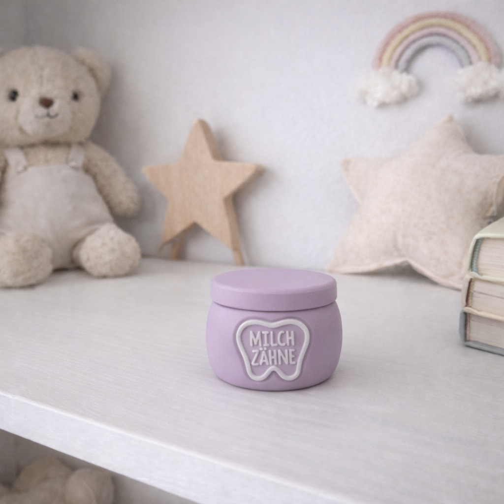 Damit die kleinen Zähnchen schön und sicher gesammelt werden können, habe ich eine hölzerne Milchzahndose gestaltet, die mit dem Kindernamen personalisiert wird.